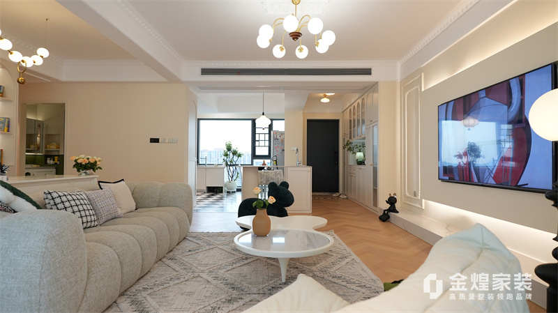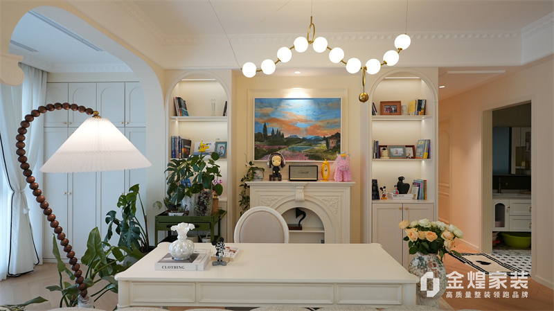 該案例整體色調柔和淡雅,家具造型簡約,線條流暢,同時融入了一些法式元素,如精致的吊燈、優雅的拱形門洞和浪漫的裝飾細節,既保留了法式風格的浪漫與優雅,又兼具現代簡約的簡潔與實用。