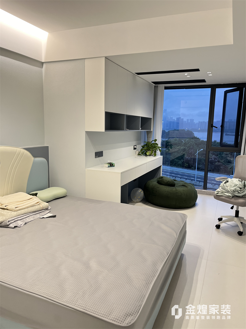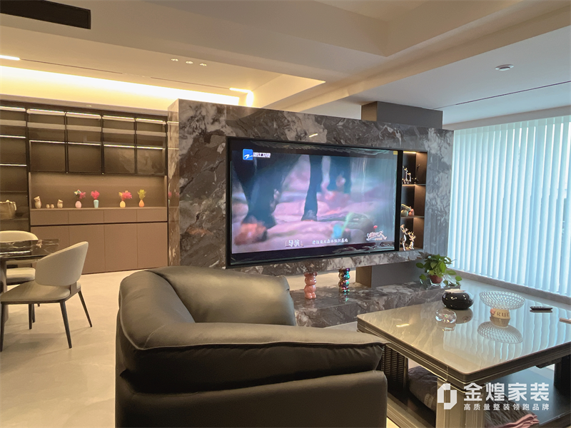 整體色調(diào)偏冷色,家具選用深色家具讓空間更有層次。地面采用750*1500瓷磚通鋪,讓有限空間顯得更敞亮。