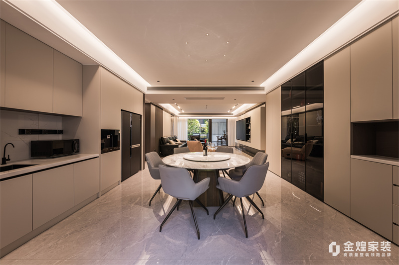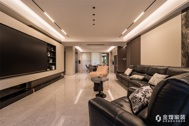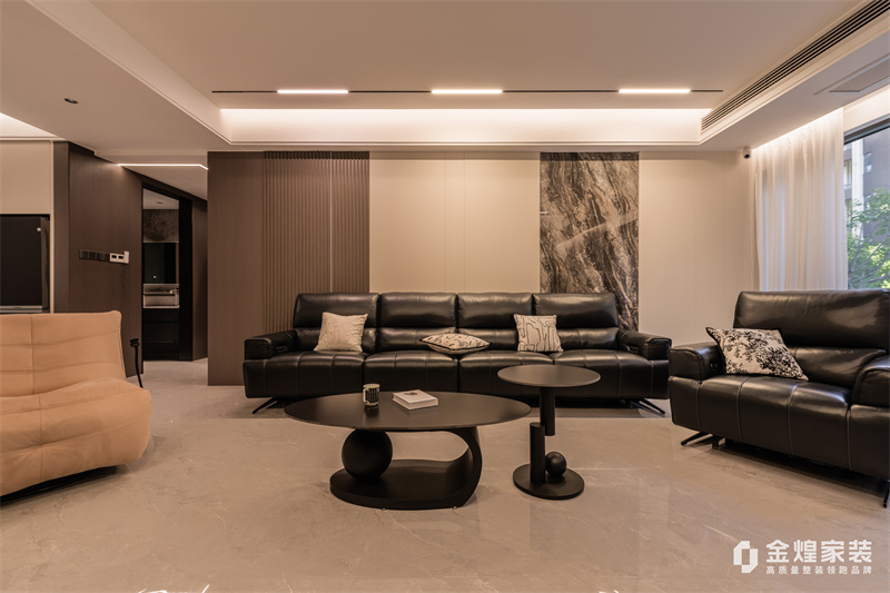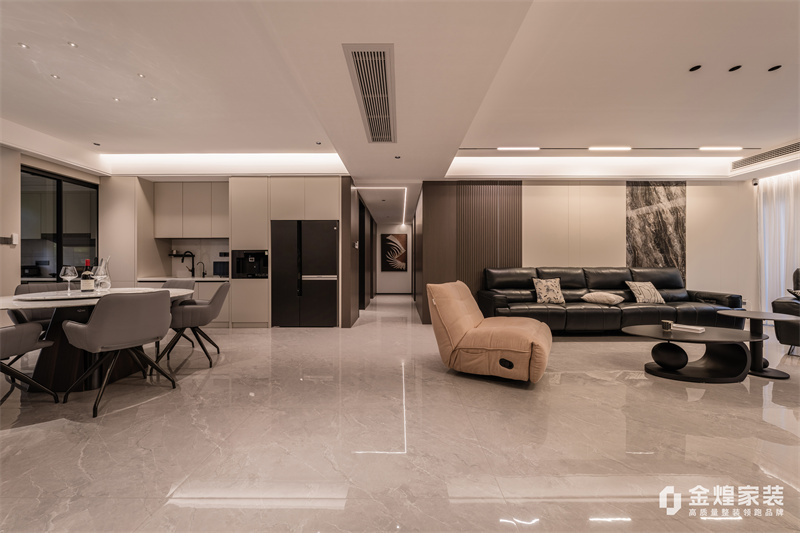 本案整體以意式輕奢為主基調,去客廳化,結合輕奢主義打造意式簡約空間,整體運用了木飾面、硬包以及巖板等不同材質的碰撞,空間沉穩(wěn)大氣,質感十足。