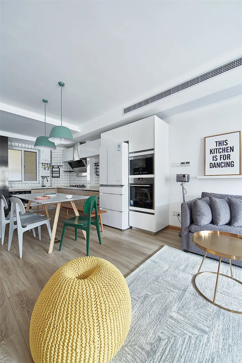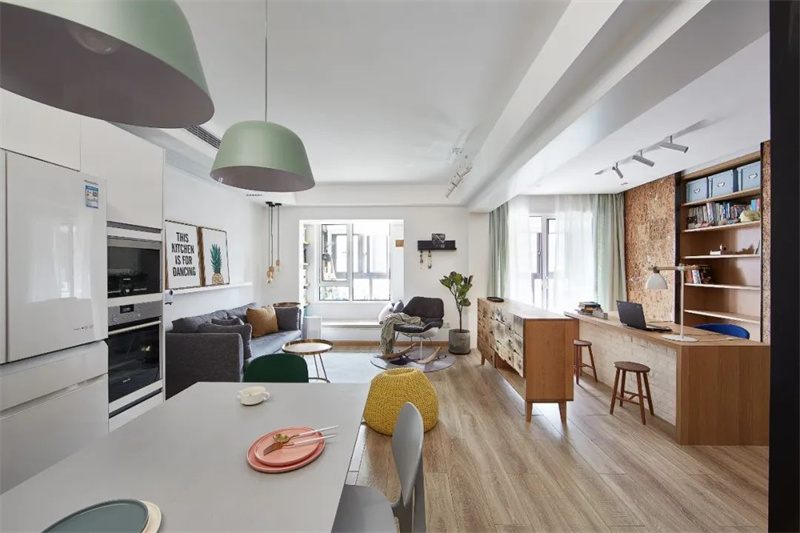 餐廳延續了客廳的設計,使用白色和灰色為主要色調。餐桌采用了簡潔的灰白色設計,配合原木色地板,為用餐區帶來了舒適感。頂部懸掛著一組現代感的吊燈,為餐區提供了柔和的照明