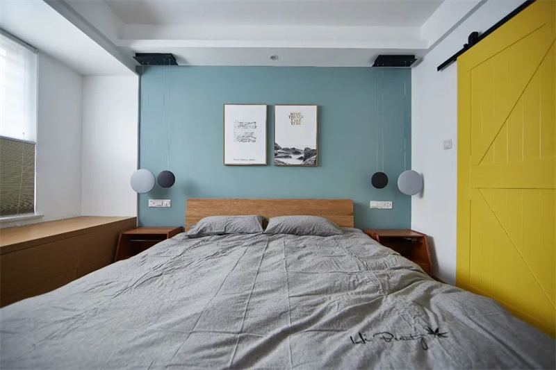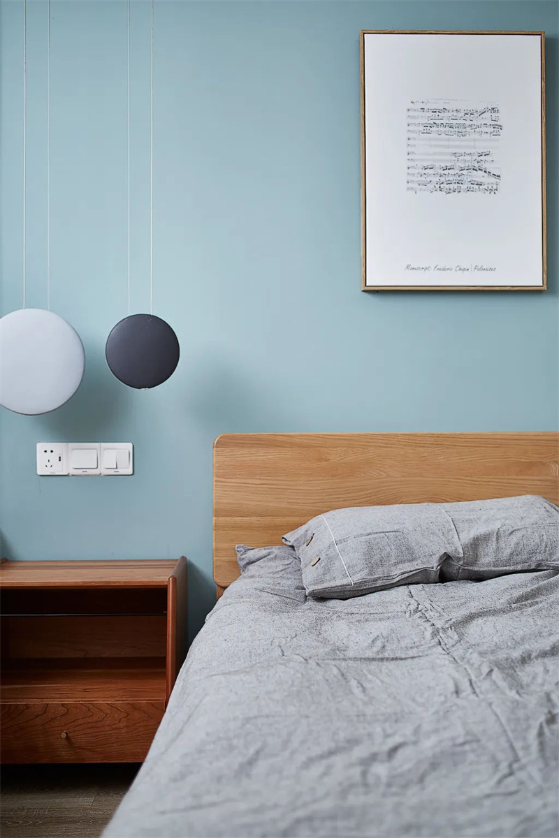 主臥室墻面是明亮的白色,藍色的床頭背景與灰色的床品組合,加上原木地板和實木家具,給空間帶來清新的自然感。主臥室的照明設計考慮到了夜間舒適的用光需求,包括床頭臺燈和壁燈,打造完美的休憩空間。