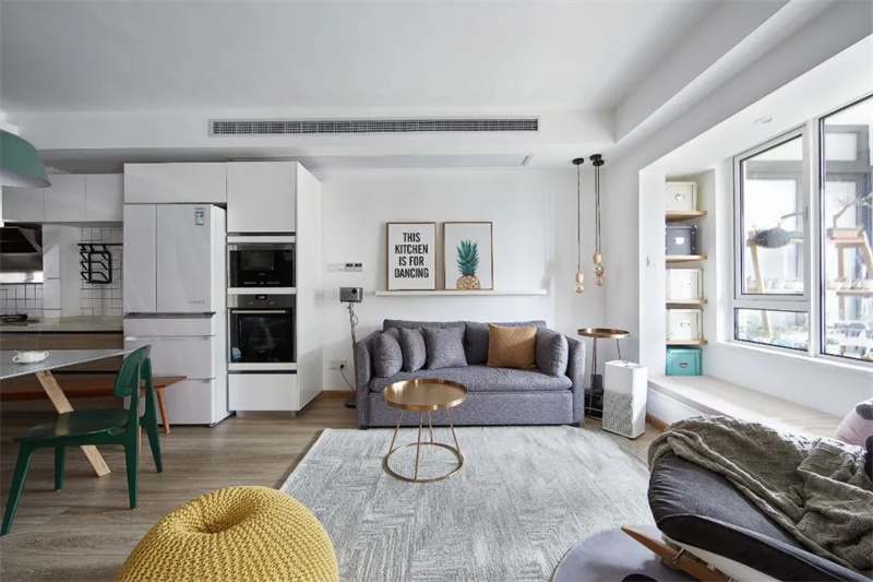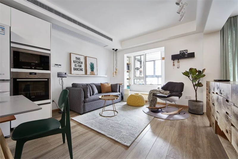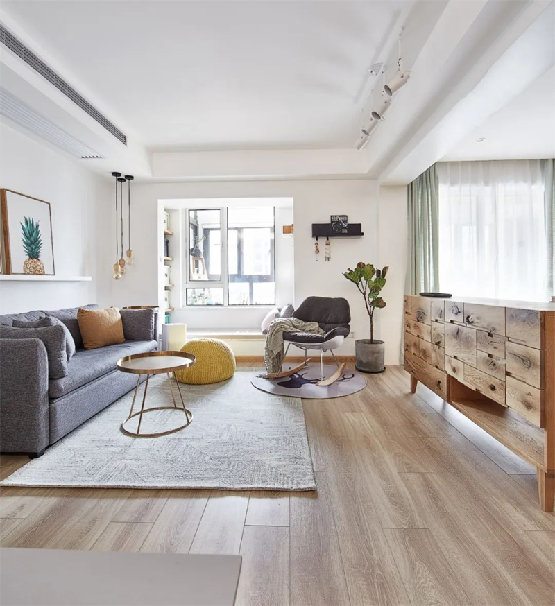 客廳是本案的亮點,白色墻壁為空間提供了明亮的背景。客廳的地板是原木色,賦予了房間自然的溫暖感。墻上裝飾著一些抽象的藝術畫作,為空間帶來些許藝術氛圍。整個客廳的設計強調了開放感和清晰的線條,讓人感到寬敞和時尚。