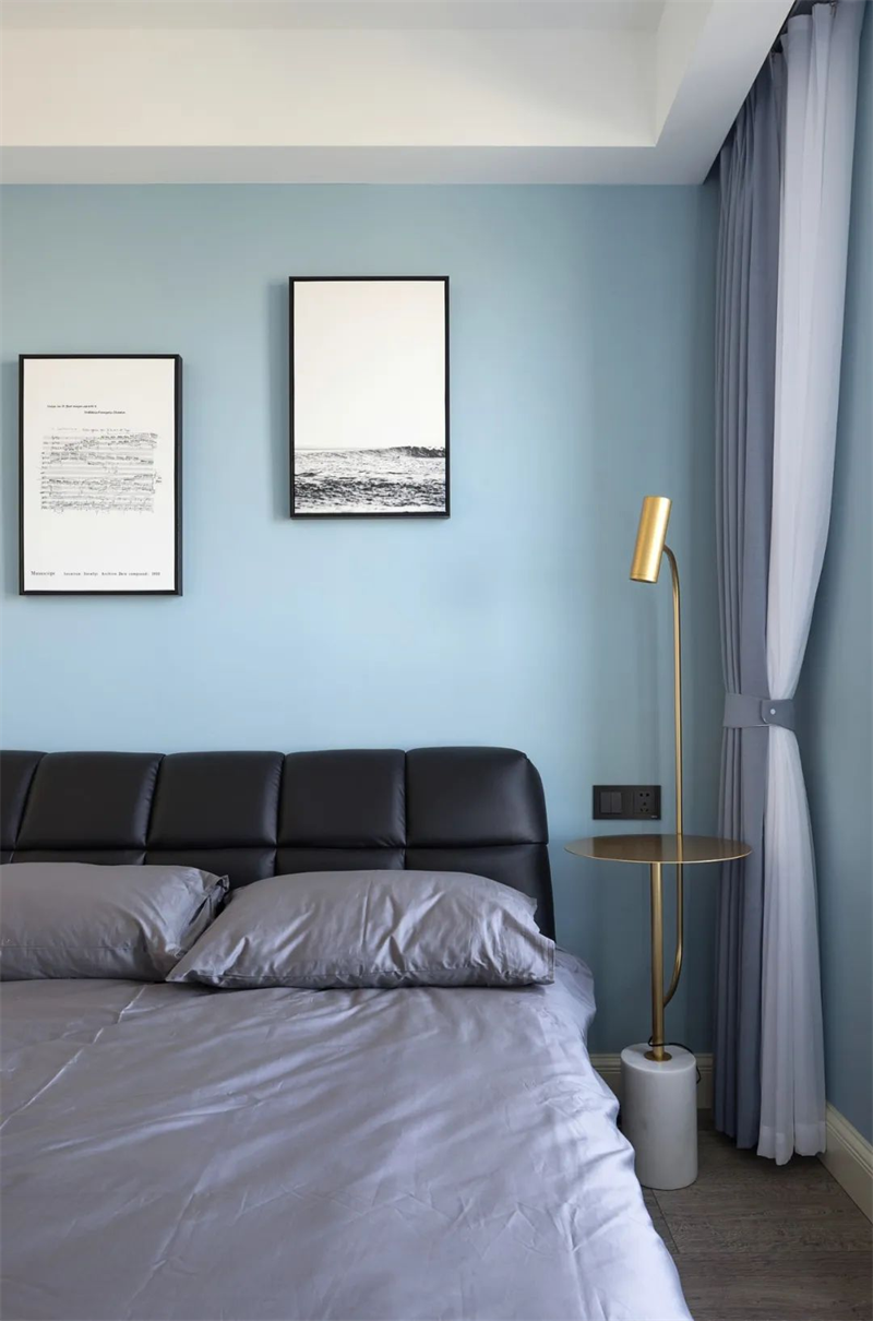 主臥采用了極簡的設計語言,白色和淺灰色墻面搭配木色地板,突顯整體空間的清新與寬敞感。床品選擇了高質感的純棉,搭配一些柔和的裝飾枕,營造出溫馨的氛圍。簡約的床頭柜和燈具設計,為主人帶來舒適輕松的睡眠空間。