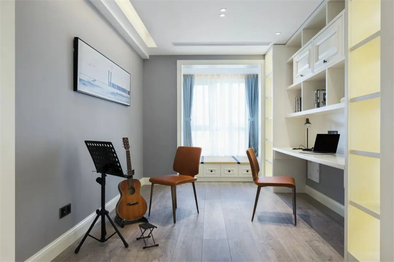 現代簡約的書房注重實用性和整體協調性。純白書桌和書架組合,打造出一個明快而整潔的學習空間。舒適的椅子、明亮的臺燈以及一些簡約的掛畫與樂器裝飾,讓這個空間兼具工作與休閑的功能。