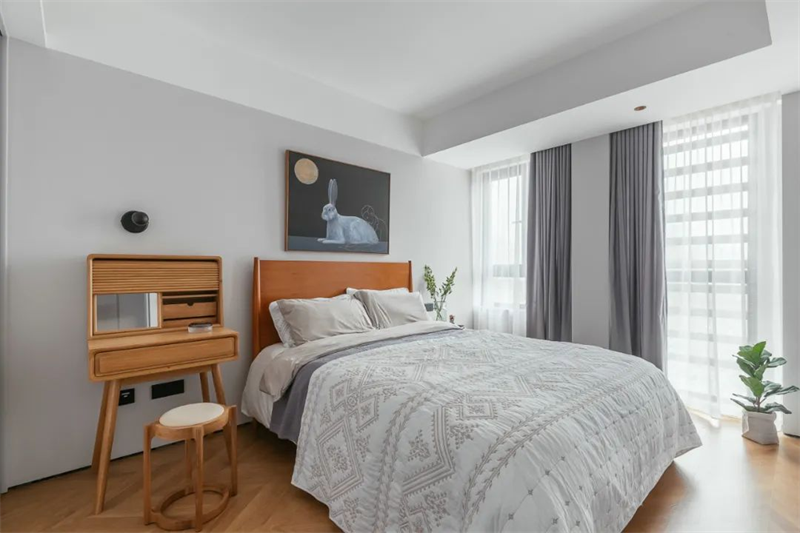 次臥延續了主臥風格,以淡色調為主,墻面和床上用品都是白色和淺灰色組合。一張舒適的雙人床與床頭柜和木制床架相配,營造出溫馨的休憩氛圍。室內擺放了綠植裝飾和北歐風格的掛畫,增添了空間的藝術感。