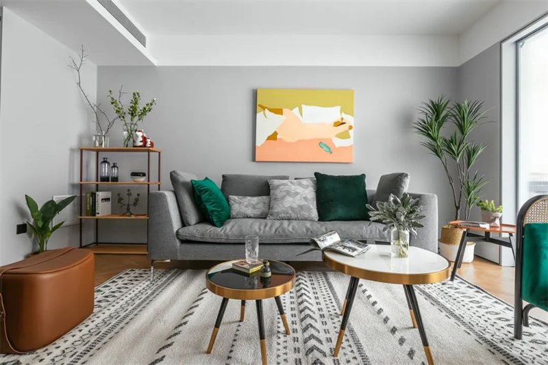 客廳灰白色墻壁和原木色的地板營造出寬敞、明亮的氛圍。大型的落地窗引入大量光線,讓人感覺仿佛置身于大自然中。一張灰色的沙發搭配著舒適的抱枕,提供了家人和朋友聚集的理想場所。加上豐富且漂亮的綠植點綴,讓空間充滿舒適的自然氣息。