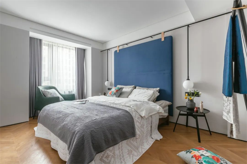 主臥以中性色調為主,墻面是淡灰色,床頭背景墻則采用了藍色的布藝面板來裝飾,柔軟舒適的床品,搭配精致的軟裝,打造溫馨愜意的睡眠空間。窗簾選用了透明的白色面料,確保足夠的自然光線進入房間,讓房間顯得更加寬敞明亮。