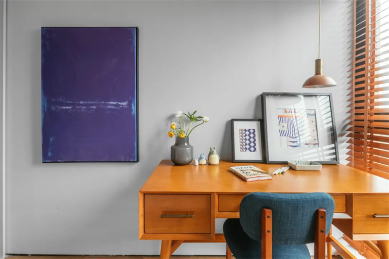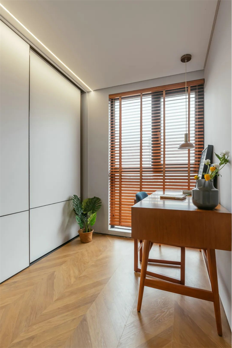 書房處于一個溫馨的角落,充滿了閱讀和學習氛圍。書桌選用一張簡約的原木桌子,搭配舒適的布藝椅子適合長時間坐靠工作和學習,打造適合靜心思考和深度閱讀的理想場所。