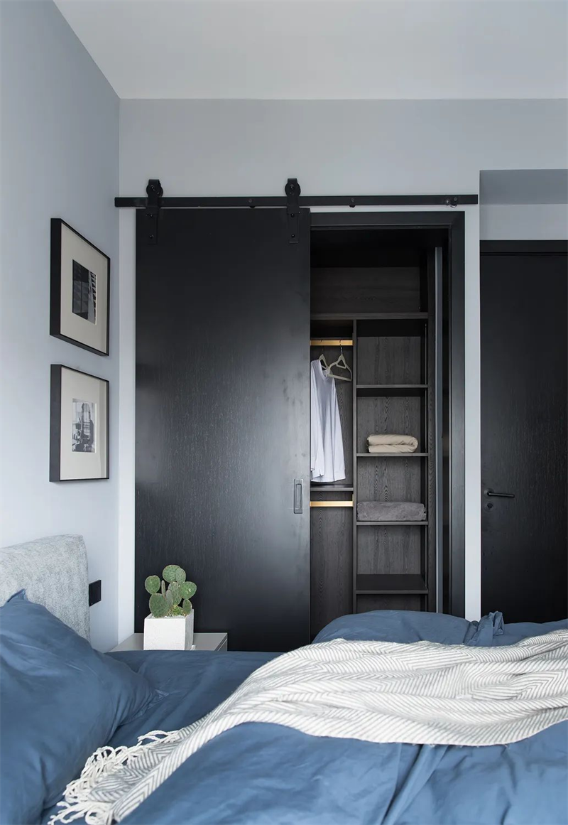 主臥室延續了整體的極簡風格,以淺灰色和白色的搭配為主,消除了多余的裝飾元素。深色的定制柜和藍灰色的床品為臥室注入了寧靜的舒適感。通過精心設計的照明,臥室的空間質感和氛圍得以突顯,使簡潔的設計與窗外的自然景色相得益彰。