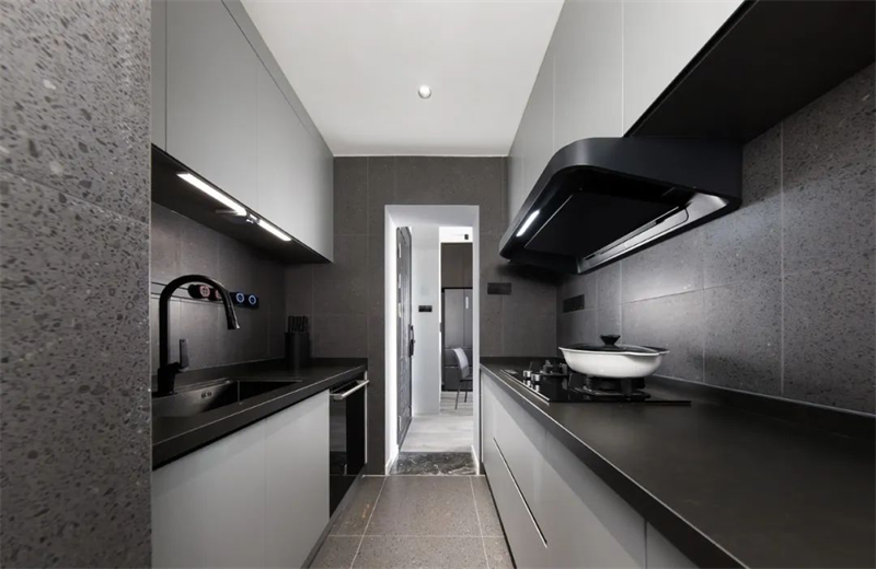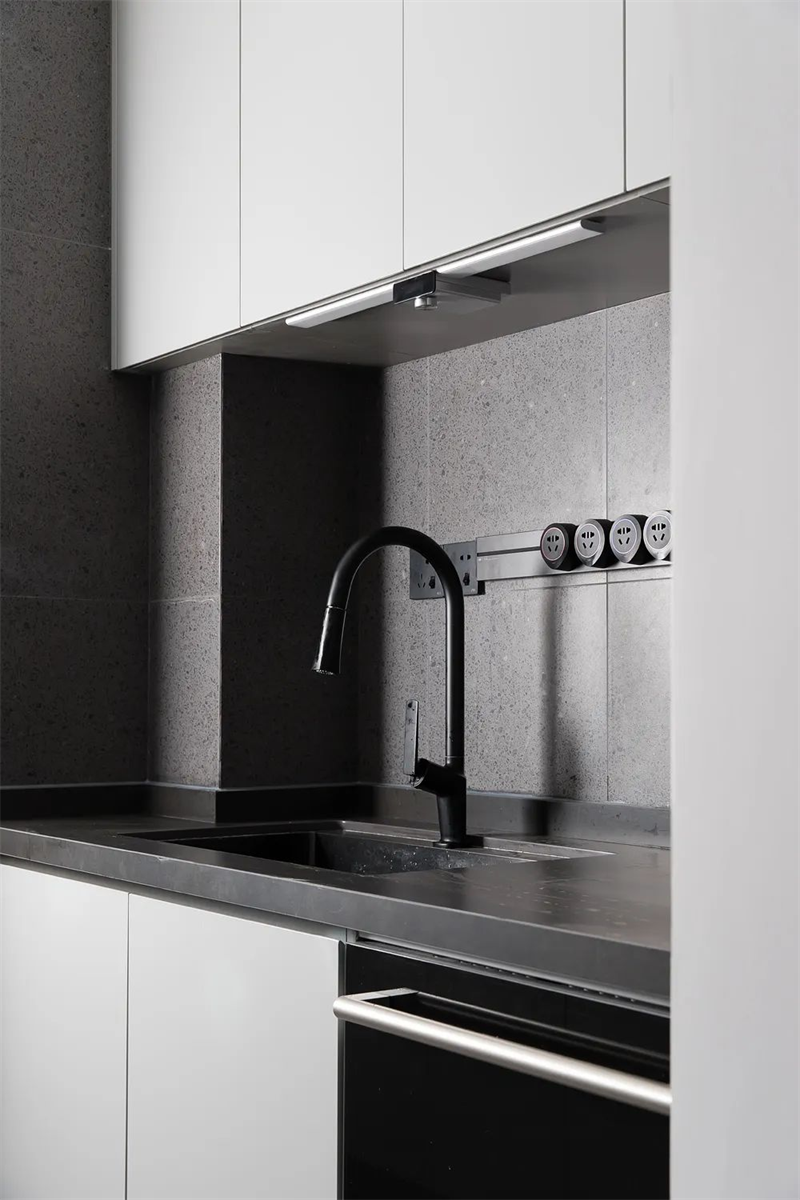 廚房是一個完美的結合了功能性和美學的空間。清潔的線條和簡約的設計元素在這里主導,灰色的定制櫥柜提供了充足的儲存空間,同時保持了整個空間的干凈度。智能燈光和智能廚房電器的使用,提高了生活的便利性,為業主打造一個理想的烹飪空間。